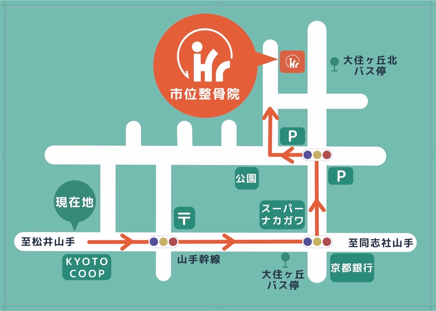 アクセスマップAccess map 住所The address 京都府京田辺市大住ケ丘2丁目1-2 電話番号0774-65-1547 E-mail: info@ichiiseikotsuin.com (柔道整復師 市位尚也 監修)